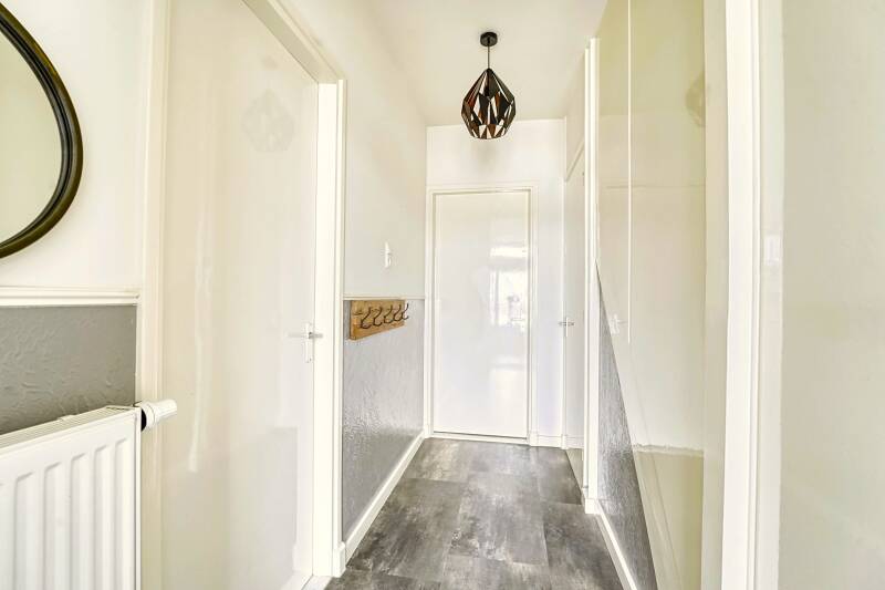 Naast de woonkamer is de gang. Achteraan is een royaal toilet. In de gang is ook de deur naar het souterrain.