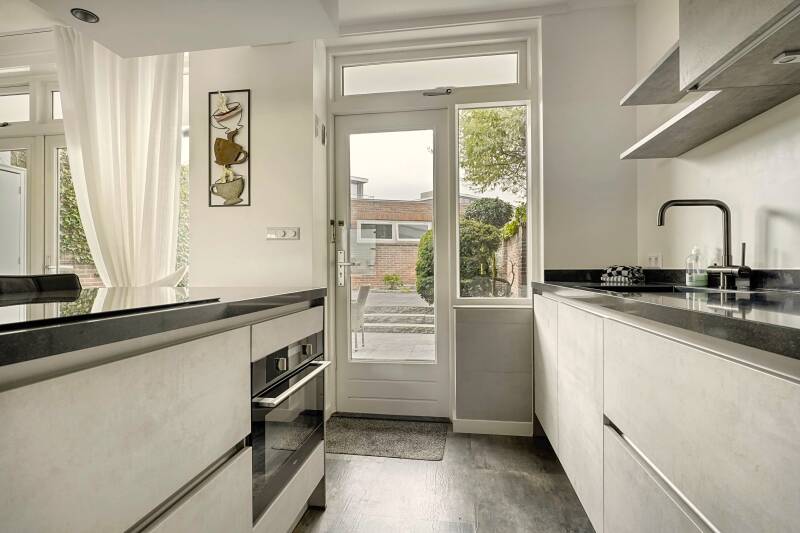 Je kunt via de voordeur naar de woning. Maar voor de begane grond loopt bijna iedereen achterom, via de tuin. Dan kom je direct in de keuken. Eventueel kun je vanuit de tuin ook direct naar het souterrain.