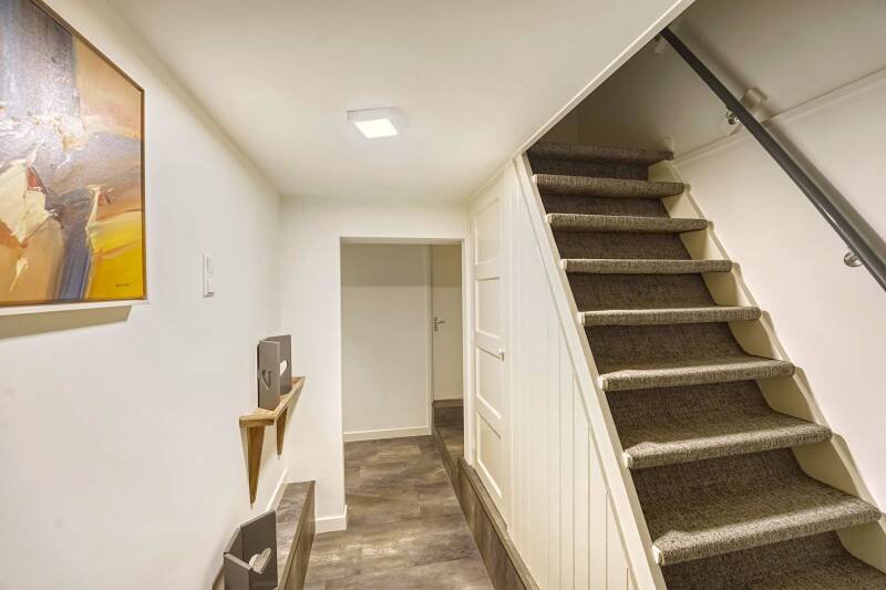 De trap aan de zijkant gaat naar het souterrain (waar de slaapkamers en de badkamer zijn). Natuurlijk kun je ook vanuit de woning naar het souterrain.